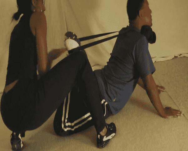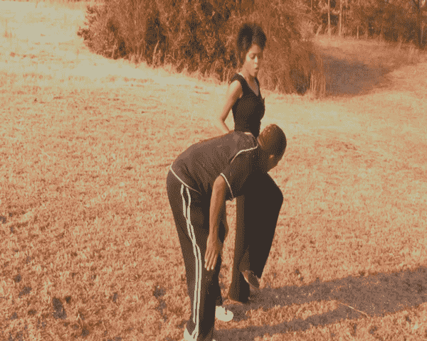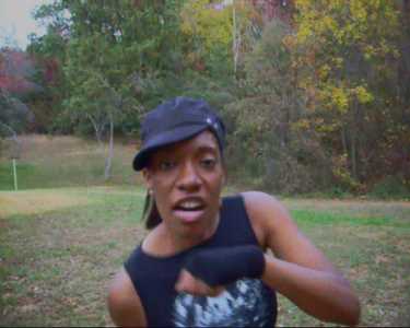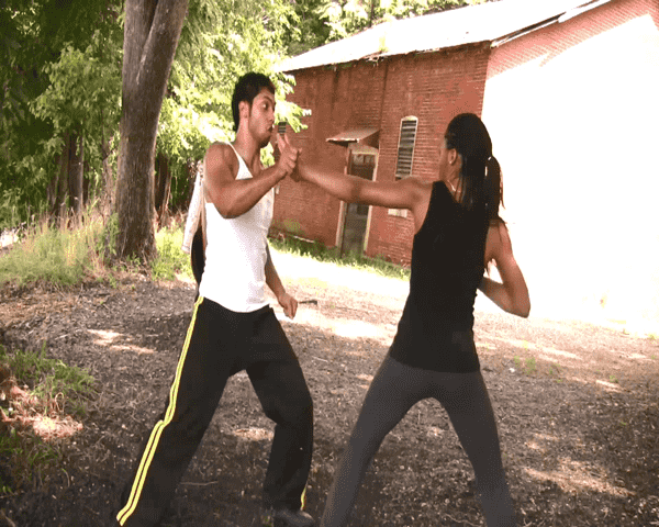 Kaykay debates dummies with her fists.