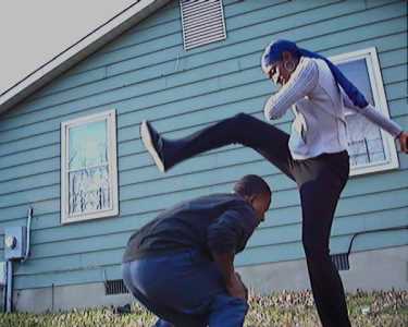 Kaykay smashes baddies beneath black boots.